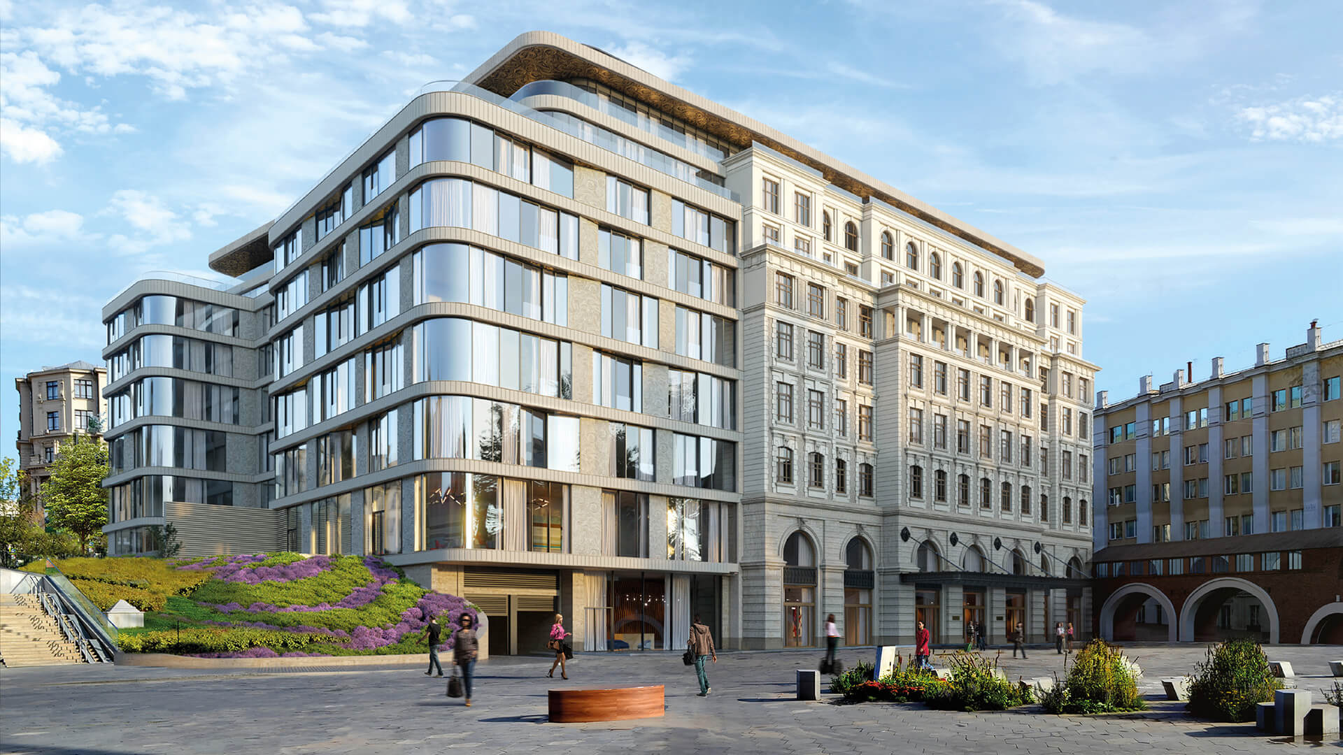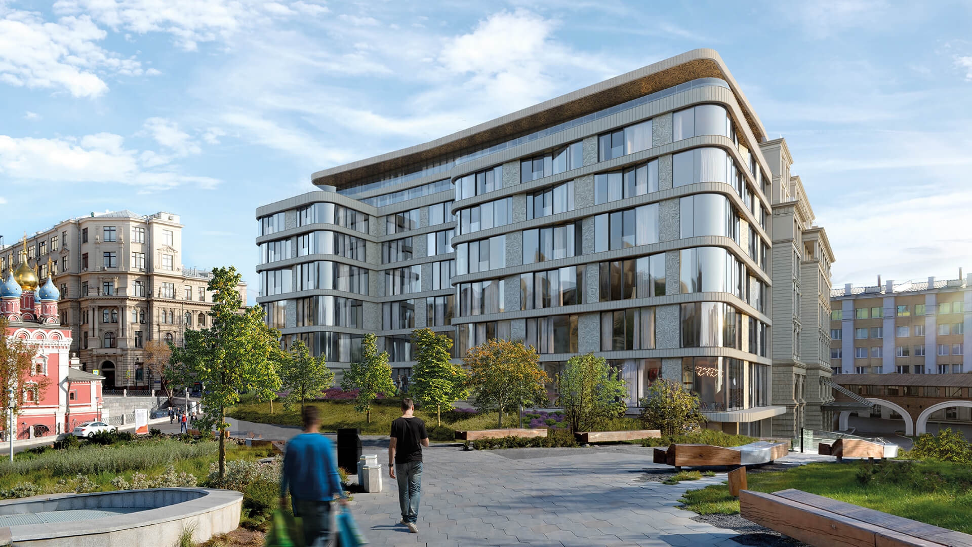 Архитектурное решение подчёркивает гармонию с окружающей средой: апартаменты открываются видами на исторические памятники и парк Зарядье, а фасады создают визуальный диалог между современными архитектурными приёмами и богатой текстурой исторической Москвы.